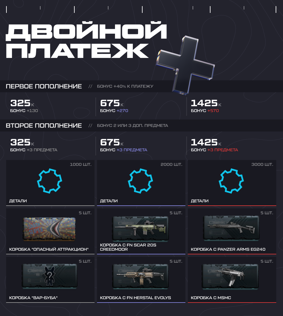 Встречайте выгодную акцию! С 12:00 мск 31 октября до 23:59 мск 2 ноября получайте на 40% больше кредитов при пополнении счета на определенные суммы. А при совершении повторного платежа вам достанутся коробки удачи с крутым оружием. Пополните склад уникальными предметами!