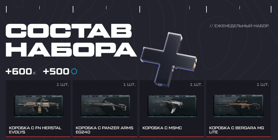 В течение декабря действует акция "Еженедельный набор". Всего вы сможете приобрести 5 наборов, в составе которых — кредиты и коробки удачи. Набор доступен для покупки с 12:00 мск понедельника до 23:59 мск воскресенья. Будьте внимательны: по понедельникам с 00:00 до 11:59 мск набор приобрести нельзя. Вы также не сможете приобрести больше 1 набора в неделю.