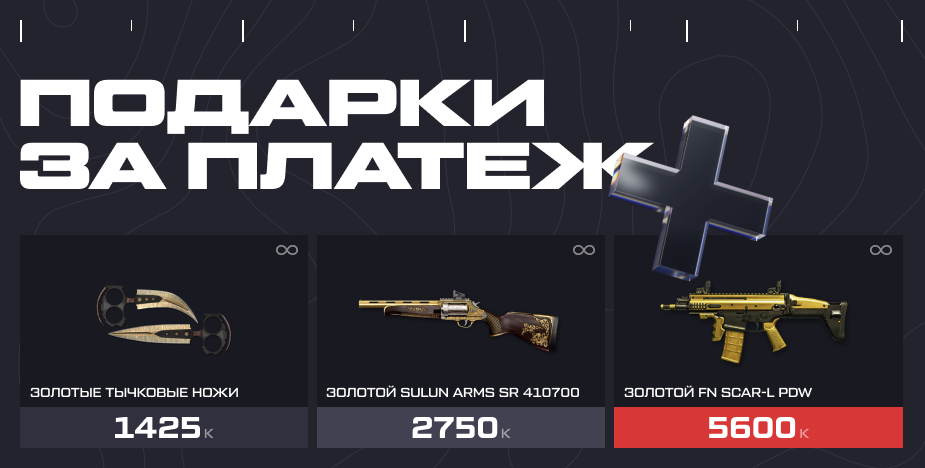 Встречайте выгодное предложение! Совершите платеж на фиксированную сумму и получите золотое оружие в подарок. Акция действует с 12:00 мск 8 декабря до 23:59 мск 10 декабря для сумм в 1425, 2750 или 5600 кредитов.