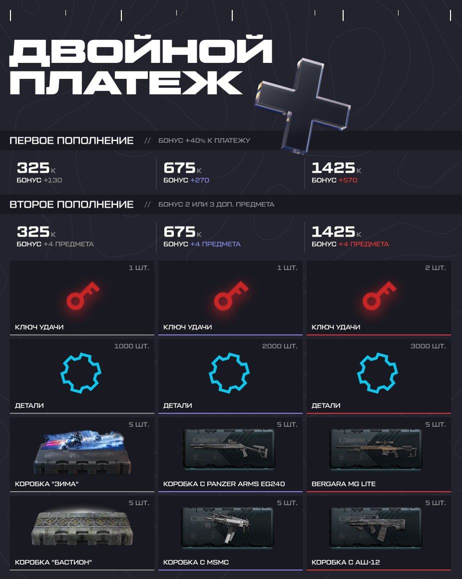 Пополняйте счет с выгодой! С 12:00 мск 19 декабря до 23:59 мск 21 декабря получайте на 40% больше кредитов при пополнении счета на определенные суммы. А при совершении повторного платежа вам достанутся "Ключи удачи", крутое оружие на время и коробки удачи с ним. Обновите свой арсенал!