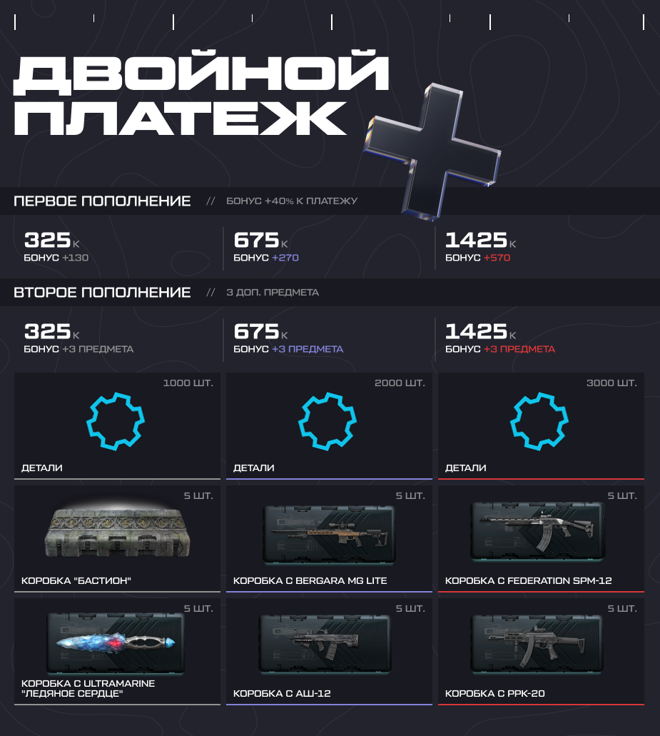 Бонусные кредиты будут сразу отправлены на ваш счет, а оружие и коробки удачи вы найдете в инвентаре на странице "Сервисы". Обратите внимание: подарки за каждое пополнение счета выдаются только один раз в течение акции.