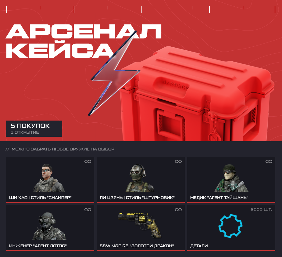 Если количество купленных ежедневных наборов достигнет 10 экземпляров — вы также сможете открыть кейс с агентами и оружием навсегда и забрать любую награду из предложенных по своему выбору. Нажмите на изображение ниже, чтобы увидеть полный список предметов в кейсе.