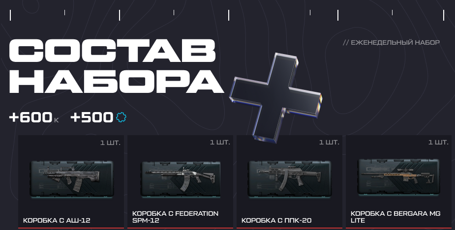 В течение марта действует акция "Еженедельный набор". Всего вы сможете приобрести 5 наборов, в составе которых кредиты и коробки удачи. Набор доступен для покупки с 12:00 мск понедельника до 23:59 мск воскресенья. Будьте внимательны: по понедельникам с 00:00 до 11:59 мск набор приобрести нельзя. Вы также не сможете приобрести больше 1 набора в неделю.