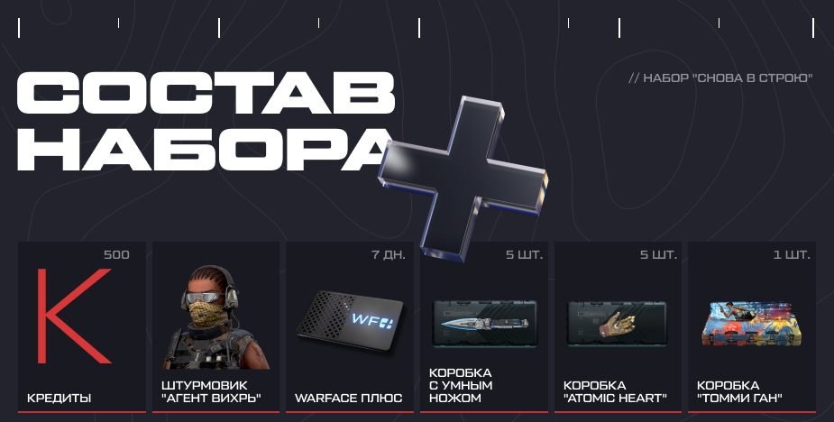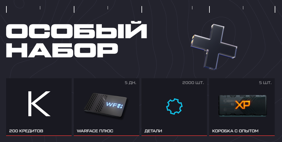 Пополните арсенал с выгодой! Набор доступен по цене в 50 рублей, в его составе 200 кредитов, временный доступ к сервису Warface Плюс, детали и коробки с опытом. Предложение доступно пользователям, которые создали аккаунт до 31.12.25 и не совершали покупки с 01.01.26 по 24.03.26.