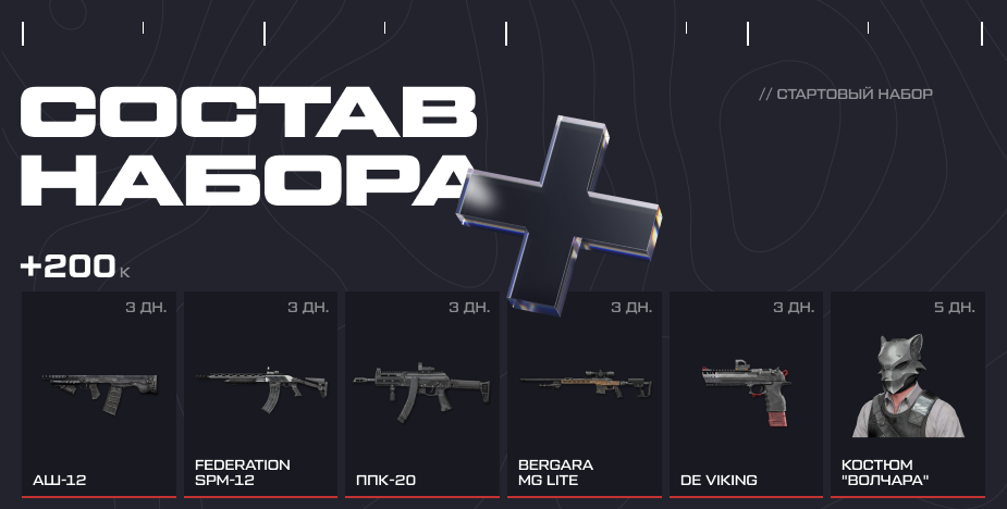 Недавно создали аккаунт? Смело воспользуйтесь выгодным предложением! Стоимость набора — 25 рублей. В его составе кредиты, крутое оружие и костюм "Волчара". Набор доступен для аккаунтов, зарегистрированных 25.03.26 и позже.