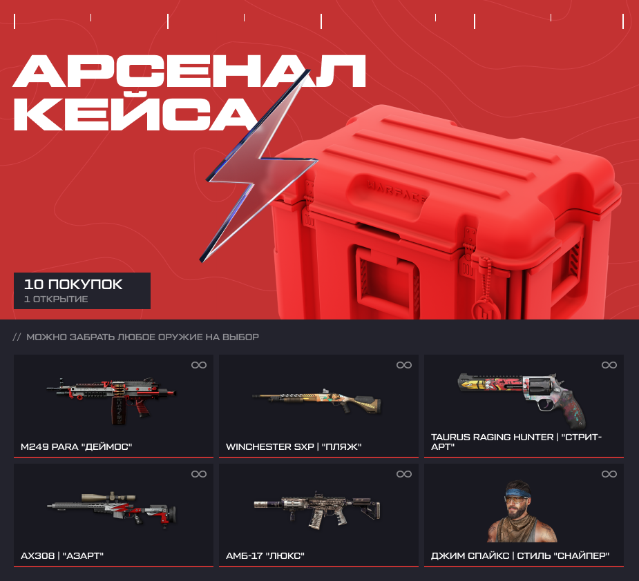 Если количество купленных ежедневных наборов достигнет 10 экземпляров — вы также сможете открыть кейс с агентами и оружием навсегда и забрать любую награду из предложенных по своему выбору. Нажмите на изображение ниже, чтобы увидеть полный список предметов в кейсе.