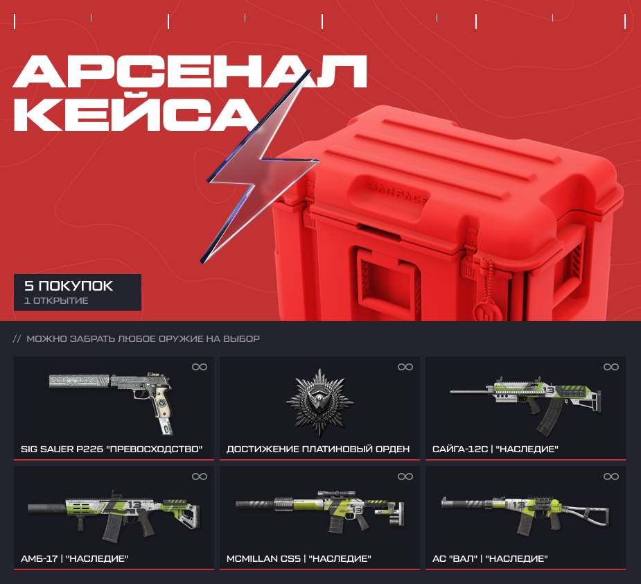 Если количество купленных ежедневных наборов достигнет 10 экземпляров — вы также сможете открыть кейс с агентами и оружием навсегда и забрать любую награду из предложенных по своему выбору. Нажмите на изображение ниже, чтобы увидеть полный список предметов в кейсе.