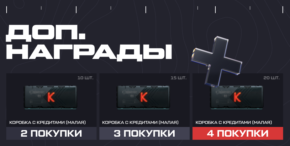 Успейте воспользоваться уникальным предложением! С 12:30 мск 25 марта до 23:59 мск 25 апреля будут доступны новые наборы, в составе которых кредиты, коробки удачи и временное оружие. Обратите внимание: каждый набор можно купить только один раз. Воспользоваться предложением могут игроки, подходящие под условия. Проверьте вкладку наборов, чтобы узнать, можете ли вы приобрести новинки. На комплекты не действуют другие акции или скидки.