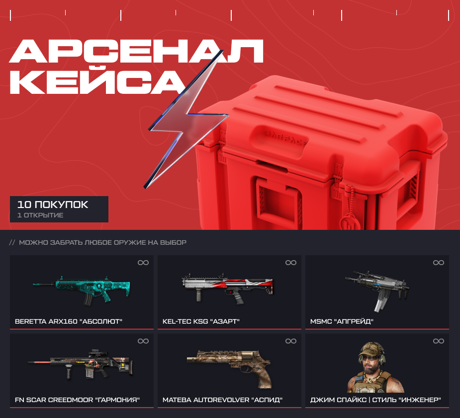 Если количество купленных ежедневных наборов достигнет 10 экземпляров — вы также сможете открыть кейс с агентами и оружием навсегда и забрать любую награду из предложенных по своему выбору. Нажмите на изображение ниже, чтобы увидеть полный список предметов в кейсе.