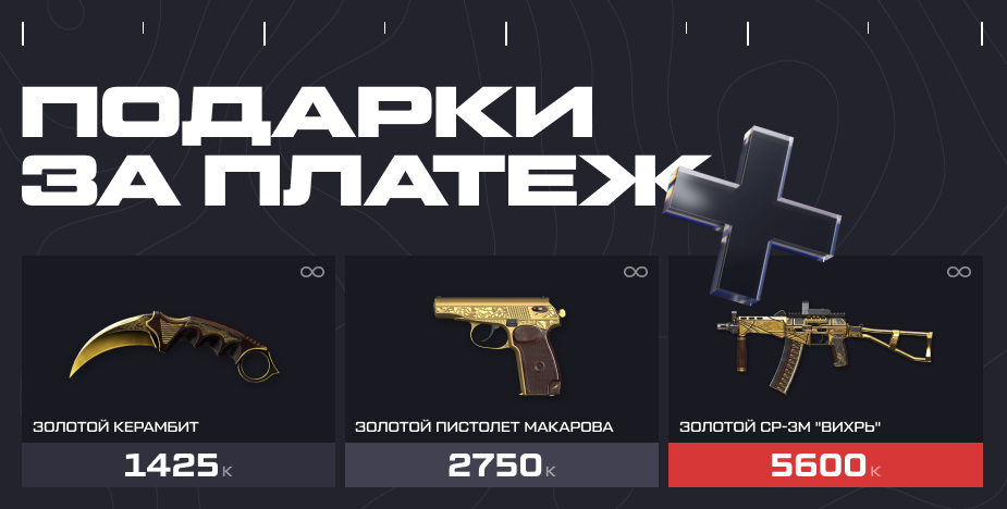 Не упустите выгоду! Совершите платеж на фиксированную сумму и получите золотое оружие в подарок. Акция действует с 12:00 мск 27 апреля до 23:59 мск 29 апреля для сумм в 1425, 2750 или 5600 кредитов.